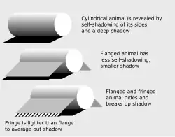 Some animals, such as the horned lizards of North America, have evolved elaborate measures to eliminate shadow. Their bodies are flattened, with the sides thinning to an edge; the animals habitually press their bodies to the ground; and their sides are fringed with white scales which effectively hide and disrupt any remaining areas of shadow there may be under the edge of the body.[69] The theory that the body shape of the horned lizards which live in open desert is adapted to minimise shadow is supported by the one species which lacks fringe scales, the roundtail horned lizard, which lives in rocky areas and resembles a rock. When this species is threatened, it makes itself look as much like a rock as possible by curving its back, emphasizing its three-dimensional shape.[69] Some species of butterflies, such as the speckled wood, Pararge aegeria, minimise their shadows when perched by closing the wings over their backs, aligning their bodies with the sun, and tilting to one side towards the sun, so that the shadow becomes a thin inconspicuous line rather than a broad patch.[70] Similarly, some ground-nesting birds, including the European nightjar, select a resting position facing the sun.[70] Eliminating shadow was identified as a principle of military camouflage during the Second World War.[71]