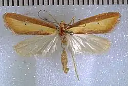 ♂. 24 mm. Head light yellow. Palpi—second segment ferruginous except at apex which is yellow, terminal segment yellow. Antennae fuscous, closely annulated with darker, basal segment ferruginous, ciliations almost 1. Thorax yellow, tegulae and a broad median stripe ferruginous. Abdomen ochreous-white, Legs ochreous-white, anterior pair mixed with ferruginous. Forewings elongate-trianglar [sic], costa moderately arched, apex rounded, termen slightly rounded, oblique; ferruginous; a broad stripe of yellow occupying median portion of wing, sharply separated in a straight line from costal ferruginous area, and suffusedly margined with ferruginous along dorsum and termen; a prominent blackish-ferruginous dot in disc at 2⁄3, broadly margined anteriorly with metallic white: fringes ferruginous. Hindwings shining white tinged with ochreous: fringes pink.[3]