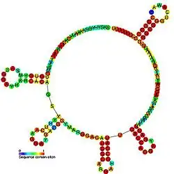 The PrrB/RsmZ RNA family are a group of related non-coding RNA molecules found in bacteria. PrrB RNA is able to phenotypically complement gacS and gacA mutants and is itself regulated by the GacS-GacA two-component signal transduction system.[1] Inactivation of the prrB gene in Pseudomonas fluorescens F113 resulted in a significant reduction of 2, 4-diacetylphloroglucinol (Phl) and hydrogen cyanide (HCN) production, while increased metabolite production was observed when prrB was overexpressed.[1] The prrB gene sequence contains a number of imperfect repeats of the consensus sequence 5′-AGGA-3′, and sequence analysis predicted a complex secondary structure featuring multiple putative stem-loops with the consensus sequences predominantly positioned at the single-stranded regions at the ends of the stem-loops. This structure is similar to the CsrB and RsmB regulatory RNAs (CsrB/RsmB RNA family),[1] suggesting this RNA also interacts with a CsrA-like protein.