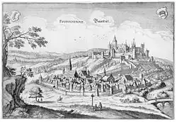 Financial difficulties forced the Bishop to sell the Ajoie (including Porrentruy) back to the lords of Montbéliard in 1386. But in 1461, the town once again became subject to the episcopal see. Because of the Reformation in Basel, the Bishopric moved its official headquarters to Porrentruy in 1527.[5] Under Bishop Jakob Christoph Blarer von Wartensee, who reigned from 1575 to 1608, the town reached the apogee of its importance. In his time, many architectural projects, including expansion of the castle and the building of a Jesuit college, were undertaken. This period of prosperity ended in 1618 with the outbreak of the Thirty Years' War. Porrentruy was repeatedly occupied, besieged, and plundered.