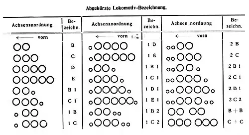 Further details such as 'bus' ("Omnibus") were spelt out in full. With the addition of phrases like 'with trailing axle' ("mit hinterer Laufachse") it was possible to distinguish whether a carrying wheelset was in front of or behind the coupled wheels. Following on were further descriptions in order to differentiate the different locomotives. So, for example, the name of the design company, or the name of the railway division that first procured the engine, or the fact that the locomotive was built to certain standards, were added. This classification system continued even after the introduction of the 1903 scheme. From 1910 the detail of the wheel arrangement as a fraction was replaced by a combination of figures for carrying axles and letters for coupled axles (see UIC classification).