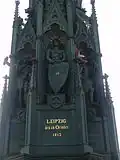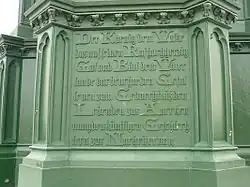 On the eastern side of the monument under the memorial inscription for the Battle of Großgörschen (aka Lützen) there is the dedication: "The King to the People, which at his call magnanimously offered its wealth and blood for the Fatherland, to the Fallen in memoriam, to the Living with acknowledgement, to Future Generations for emulation."[3] This dedication was authored by August Boeckh, a member of the philosophical class of the Prussian Academy of Sciences commissioned to write it.[4] Frederick William III had rejected three alternative proposals by the philosophical class.[4] This dedication may be considered problematic, inasmuch as it was not the king who had called his people, but the stubborn people, commoners, lower-ranking bureaucrats, military men, and members of the nobility who had stolen a march on the king.