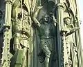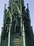 The national monument is crowned by an Iron Cross.[26] On the occasion of the inauguration the king renamed Götze'scher Berg into Kreuzberg (i.e. cross mountain) after the Iron Cross topping the monument.[26] The monument is adorned with twelve statues symbolising twelve major battles of the Liberation Wars, however, at the inauguration only two of the statues had been installed, and two others were represented by plaster models painted like cast iron.[27] On December 27 altogether six statues had been installed, the other followed over time (two on 15 January 1823, one on 22 December 1823, another on 10 March 1825, on 17 June 1826 the last two.[28] The monument's front side was directed northeastwards to the Hallesches Tor (Halle Gate).[18]