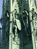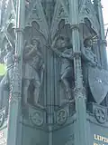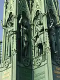 It is said that due to the influence of Crown Prince Frederick William (IV) Schinkel's design in Gothic Revival style prevailed over another in rather classicist forms.[47] The monument was decided to be made from cast iron.[48] The Royal Prussian Iron Foundry, renowned for its Berlin Iron Jewellery (Eisenkunstguss, Fer de Berlin) produced all the parts of the monument.[48] Frederick William III popularised cast iron by using it himself for decoration and table ware.[48]