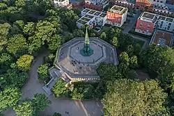 On 1 December 1829 Frederick William III asked Schinkel for proposals how to improve the visibility of the monument.[29] Schinkel's ideas, a socket or an encircling structure were never realised.[29] Schinkel had proposed to enlarge the tiny monument's plot (a radius of 53 Prussian feet; 16.634 m (54.57 ft)) by buying an additional circular spread of 150 to 200 Prussian feet (47.08 to 62.77 m (154.5 to 205.9 ft)) around the monument, however, all rejected as too costly.[30] The southerly adjacent land had meanwhile been bought by the Gericke brothers, who planned to develop the area and opened the amusement park Tivoli right south of the monument.[31][32][33] On 6 August 1848 people gathered at the monument demonstrating for the unification of Germany, rendering homage to Archduke John of Austria as regent of the to-be-unified Empire, flagging the monument with the union tricolour of Black-Red-Gold, much opposed by the various Prussian nationalist formations.[34]