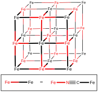 The unit cell of Prussian blue, with all sites occupied. Actually, one fourth of the Fe(CN)6 groups shown will be missing, at random, giving on average only 18 cyanide ions (rather than the 24 shown) and three ferrous iron atoms.