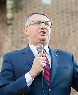 In the 2002 Polish local elections, he unsuccessfully ran for the Warsaw City Council from the list of the Electoral Committee of Voters Julia Pitera (he received 1641 votes[6]). In the 2005 Polish parliamentary election, he unsuccessfully ran for the Sejm from the Law and Justice list (he received 999 votes[7]). In 2010, he became the president of the April 10 Movement. In the 2011 Polish parliamentary elections, he won a seat in the Sejm with 4615 votes in the Warsaw electoral district from the PiS list.[8] In November of the same year, he joined PiS.[9] He left in June 2013, also leaving the PiS parliamentary club and founding the Republican Association with a republican and conservative-liberal profile, where he became the president. In October of the same year, this organization signed an agreement with former MPs of the Civic Platform (PO), engaging in Jarosław Gowin's "An Hour for Poland" project.[10] At the end of October, Przemysław Wipler resigned as president of the "Republicans"[11] (in favor of Anna Streżyńska), but less than a month later he was re-elected. His association then participated in the formation of the Poland Together party.[12] Przemysław Wipler became a member of the presidium of this party's board, but in February 2014, he left Poland Together with part of the "Republicans".[13] In March, he began cooperating with the Congress of the New Right,[14] and in May of that year, he became a member of this party.[15]
