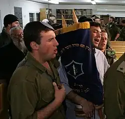 Psalm 24 is designated as the Psalm of the Day for the first day of the week (Sunday) in both the Ashkenazi and Sephardi liturgies. It was sung by the Levites after the offering of the regular daily sacrifice (tamid).[9] This tradition continued into the diaspora, as the psalm is sung on Sundays in synagogues around the world.[10] In recent centuries, Ashkenazi Jews also recite the psalm while the Torah scroll is carried back to the ark on weekdays, Rosh Chodesh, festivals, and during the Shabbat afternoon prayer. Chasidic and Sephardic Jews recite it on Rosh Hashanah and Yom Kippur after the evening prayer, and some Nusach Ashkenaz communities have adopted the practice as well.[11] In the Siddur Avodas Yisroel, the psalm is also said after Aleinu during the evening prayer on weeknights.[12] Some congregations recite this psalm during the hakafot on Simchat Torah.[13]