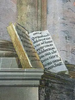 Psalm 42 is the 42nd psalm of the Book of Psalms, often known in English by its incipit, "As the hart panteth after the water brooks" (in the King James Version). The Book of Psalms is part of the third section of the Hebrew Bible, and a book of the Christian Old Testament. In the Hebrew Bible, Psalm 42 opens the second of the five books (divisions) of Psalms,[1] also known as the "Elohistic Psalter" because the word YHWH is rarely used and God is generally referred to as "Elohim".[2]
