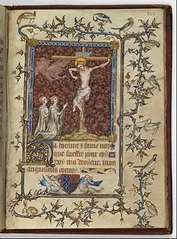 The artist most associated with the manuscript is Jean Le Noir, active in Paris between 1335 and 1375.[2] Other hands include members of his workshop and possibly his daughter, Bourgot.[3] The style seems influenced by Jean Pucelle.[4]