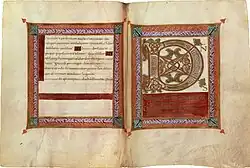 The copyist signed at the end of the manuscript on folio 172v: Hic calamus facto Liuthardi fine quievit ("Here, its job done, Liuthard's pen rested"). Liuthard is in fact responsible for the copying of several manuscripts produced at the same time for the same sovereign: the Codex Aureus of St. Emmeram in 870, or the gospels today preserved in Darmstadt (Landesbibliothek, MS 746). Liuthard could be responsible for the gold letter copy, the decorations of the text as well as the miniatures, according to Rosamond McKitterick.[2] The royal scriptorium in question, whose precise location is not known, need not have accommodated a large number of artists because the decorations of the manuscripts show great homogeneity.[1]