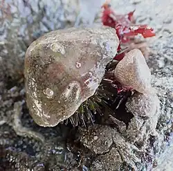 Psammechinus miliaris is sometimes present in large numbers in suitable habitats. In a shallow Zostera marina meadow off the west coast of Scotland, they were recorded at 182 per square metre and 28 per square metre on the adjacent muddy sediment.[5] In littoral habitats they can reach densities of 352 individuals per square metre.[6] Their grazing and predation have a considerable effect on the benthic ecology and if they are experimentally removed from an area, there is a significant change in the community of encrusting organisms. In one study it was found that the tube worm Pomatoceros increased as did the more ephemeral algal species. Another study found that an individual urchin could eat 8 to 12 barnacles (Semibalanus balanoides) or 6 mussels (Mytilus edulis) in a day.[3]