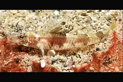 Psammogobius pisinnus is a tiny pale species of goby, with a background colour of grey to whitish and marked with three broad brown blotches on its upper sides, the first blotch is the darkest and is located underneath first dorsal fin, the cheek and gill covers are mottled dark brown, and there a whitish stripe on the middle pectoral fin rays.[1] The specific name refers to the very small size of the adults, they attain a total length of 2 centimetres (0.79 in).[2]