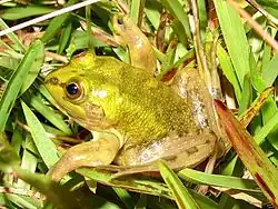 Males measure 22–46 mm (0.9–1.8 in) and females 30–57 mm (1.2–2.2 in) in snout–vent length.[2][5] The body is robust. The head is broad and the snout is rounded. The tympanum is distinct. The forearms are robust with robust fingers; no webbing is present. The hind limbs are short and robust with extensively webbed toes. The body and the limbs are dorsally light to dark green, olive, or brownish. There are usually some darker spots or blotches of irregular form. A black or dark green stripe runs along the canthus rostralis; it can be narrow or broad and blot-like. The tympanum is olive, tan or light brown. The lateral surfaces of head, body, and thigh are light yellow. Ventral surfaces are white. Males have paired vocal sac.[2]