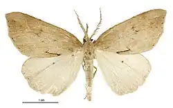 ♂︎. 47 mm. Head, palpi, and thorax dull yellowish-brown, face paler. Antennae moderately bipectinated, yellowish - brown. Abdomen pale yellow-brown. Forewings strongly arched at base, costa faintly sinuate, apex subacute, termen sinuate, rounded beneath, oblique; dull yellowish-brown with a few scattered blackish scales, most plentiful near apex; basal line indicated by a few blackish scales at dorsum; first line much interrupted, dentate, black, most pronounced as an inwardly oblique mark on dorsum; a series of obscure interneural black dots on termen : cilia dull yellowish-brown with obscure darker line. Hindwings, termen sinuate; very pale yellowish-brown; a prominent black discal dot and some black scales round termen : cilia pale yellowish-brown with faint darker line and tips whitish.[3]