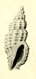 Sculpture: The radials are discontinuous from whorl to whorl, feeble and oblique on the shoulder, prominent and perpendicular on the peripheral area, and traversing the basal excavation, widely spaced. There are on the body whorl ten spirals slighter than the radials. On the fasciole area of the body whorl are three faint and narrow threads. From the shoulder to the basal angle are five cords, which override the ribs and thus enclose a series of oblong and nearly uniform meshes. On the snout are six crowded and progressively diminishing beaded spirals. The upper whorls carry four spirals. Within the meshes are fine radial striae. The basal furrow is spaced as if a spiral of regular sequence to the rest were omitted. The aperture is unusually wide. The varix is prominent, more massive than the ribs. The sinus is shallow. The siphonal canal is bent, short, and open.