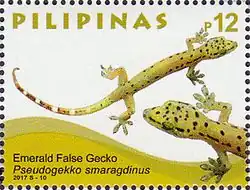 Pseudogekko smaragdinus (or green smooth-scaled gecko, Polillo false gecko or emerald false gekko) is a species of gecko, which is one of the many types of lizard. It is endemic to the Philippines, where it is listed by the IUCN as "least concern," presumably because populations are currently stable; this gecko is fairly common in the forests of Polillo Island, however, it is quite difficult to find in most other areas.[1]