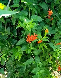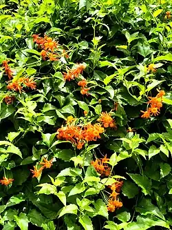 Pseudogynoxys chenopodioides (syn. Senecio confusus), known commonly as Mexican flamevine,[3] orange-flowered groundsel[4] and orange glow vine,[5] is a climber in the family Asteraceae, native to Central America and northern South America.[4] It is a vigorous vine with thick evergreen, deep green leaves and bright orange daisy-like flowers, which are borne in clusters, and usually bloom all year round.[6]