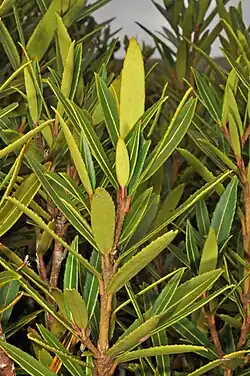 Adult leaves are shorter and slightly wider than juvenile leaves, being 5–10 cm (2.0–3.9 in) long and 0.75–1 cm (1⁄4–1⁄2 in) wide.[2] They are still thick but more linear-lanceolate in shape with a rounded obtuse or pointed acute leaf tip.[2] The adult leaves also grow on thick petioles, 5 mm long, but have a slightly less prominent toothed or smooth leaf margin.[2][5] Leaves are simple and alternate,[6] with adult leaves tending to crowd at the tips of the branchlets.[10]