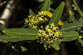 This species typically grows to be 3 metres (9.8 feet) tall and appears with long, narrow, and slightly serrated green or brown leaves.[2][5] Juvenile leaves are longer than adult leaves and have a more prominent serrated margin.[5] In summer, the adult plant produces small yellow-green flowers, which are followed by small purple fruit.