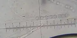 The asci are roughly cylindrical with a long stem-like base; the entire ascus is often as long as 300–325 μm and about 15 μm in diameter at the thickest point. The spores are round, smooth, translucent (hyaline), and have diameters of about 12–14 μm.[8] They are filled with many small oil droplets.[10] The paraphyses (sterile filamentous hyphae in the hymenium) are enlarged at their tips and filled with brown colored matter, about 4 μm thick.[8]