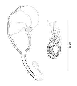 The reproductive organ include a single ovary and a single testis. The sclerotized male copulatory organ, or "quadriloculate organ", has the shape of a bean with four internal chambers, as in other species of Pseudorhabdosynochus. The vagina also includes a sclerotized part, which is a complex structure. The sclerotised vagina comprises an anterior trumpet, followed by a primary canal, a primary chamber, a secondary canal, a secondary chamber and an accessory structure. The trumpet is in continuity with the unsclerotised vagina. The primary canal is thin-walled, with regular diameter and wide lumen, and is coiled once. The primary chamber is heavily sclerotised, and complex in shape: a pear-shaped cavity continued as a heavily sclerotised cylinder arising from its thinner, posterior part; the cylinder curves and runs parallel with the longitudinal axis of the pear-shaped cavity; the cylinder continuous with primary canal. The secondary canal is thin, with an indistinct central lumen. The secondary canal is inserted into the cylinder of the primary chamber. The secondary chamber is continuous with the secondary canal, sclerotised, and elongate, ventral to and much smaller than the primary chamber. The accessory structure is small, inserted into the anterior extremity of the secondary chamber. The external and internal surfaces of the primary and secondary chambers are smooth.[1][2]