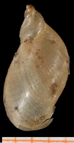 Pseudosuccinea columella, the American ribbed fluke snail, is a species of air-breathing freshwater snail, an aquatic pulmonate gastropod mollusk in the family Lymnaeidae, the pond snails.