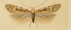 The wingspan is 9–16 mm.[3] The head is whitish-ochreous. Terminal joint of palpi shorter than second. Forewings whitish ochreous, partly suffused with pale brownish-ochreous; usually some black scales on a basal dot, two or three costal marks, and round termen in cilia; two black dots transversely placed in disc at 1/4; stigmata black, first discal above plical, another black dot below second discal. Hindwings 1, light grey. The larva is yellowish-green; dots black;head pale brown.[4][5][6][7]