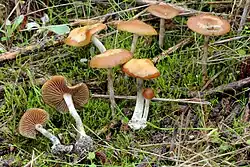 Psilocybe cyanescens, commonly known as the wavy cap or potent psilocybe,[1] is a species of potent psychedelic mushroom. The main compounds responsible for its psychedelic effects are psilocybin and psilocin. It belongs to the family Hymenogastraceae. A formal description of the species was published by Elsie Wakefield in 1946 in the Transactions of the British Mycological Society, based on a specimen she had recently collected at Kew Gardens.[2] She had begun collecting the species as early as 1910.[3][4] The mushroom is not generally regarded as being physically dangerous to adults.[5][6] Since all the psychoactive compounds in P. cyanescens are water-soluble, the fruiting bodies can be rendered non-psychoactive through parboiling, allowing their culinary use. However, since most people find them overly bitter and they are too small to have great nutritive value, this is not frequently done.[5]