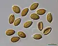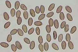 P. cyanescens has elliptical spores which measure 9–12 x 5–8 μm.[9] According to some authors, the holotype collection of the species from Kew Gardens featured no pleurocystidia, but North American collections are characterized by common clavate-mucronate pleurocystidia.[5][6] However, pleurocystidia are present in the holotype collection (but not easily to observe since hymenium is collapsed). In European collections of P. cyanescens, pleurocystidia are common and their shape is identical to those known from the United States.[2][10] In 2012, an epitype from Hamburg, Germany was designated.[11]