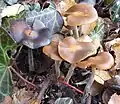 Psilocybe cyanescens has a hygrophanous pileus (cap) that is caramel to chestnut-brown when moist, fading to pale buff or slightly yellowish when dried. Caps generally measure from 1.5–5 cm (1⁄2–2 in) across, and are normally distinctly wavy in maturity.[1] The color of the pileus is rarely seen in mushrooms outside of the P. cyanescens species complex. Most parts of the mushroom, including the cap and Lamellae (gills, underneath the cap) can stain blue when touched or otherwise disturbed, probably due to the oxidation of psilocin.[6][8] The lamellae are adnate, and light brown to dark purple brown in maturity, with lighter gill edges. There is no distinct annulus, but immature P. cyanescens specimens do have a cobwebby veil which may leave an annular zone in maturity.[1] Both the odor and taste are farinaceous.