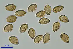 - Microscopic features: Spores (7–) 8–9 (–12) × ( 5.5 – ) 6 – 7 (–8.5) μm, rhomboid to subrhomboid in face view, subellipsoid in side view, thick-walled, with the wall 0.8 to 1.5 μm thick. One end of the spore has a broad germ pore and the other side has a short hilar appendage. Two types of cheilocystidia and pleurocystidia are present. One type of pleurocystidia measures 16 - 24 x 6 - 8 and is venstricose-rostrate. The other type is larger, 20 - 40 micrometers by 12 - 16 micrometers, globose-pyriform, sometimes with a narrow apex and narrow base. The basidia are 4 spored and measure 20 – 28 × 7 – 9 μm.[2]