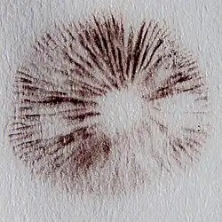 On the underside of the mushroom's cap, there are between 15 and 27 individual narrow gills that are moderately crowded together, and they have a narrowly adnexed to almost free attachment to the stipe. Their color is initially pale brown, but becomes dark gray to purple-brown with a lighter edge as the spores mature. The slender yellowish-brown stipe is 4.5–14 cm (1.8–5.5 in) long by 1–3.5 mm (0.04–0.14 in) thick, and usually slightly thicker towards the base.[2] The mushroom has a thin cobweb-like partial veil that does not last long before disappearing; sometimes, the partial veil leaves an annular zone on the stipe that may be darkened by spores.[22] The flesh is thin and membrane-like, and roughly the same color as the surface tissue. It has a farinaceous (similar to freshly ground flour) odor and taste. All parts of the mushroom will stain a bluish color if handled or bruised, and it may naturally turn blue with age.[2]