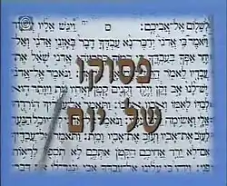 Psuko Shel Yom is aired at midnight and has been broadcasting the same platform-content for over thirty years. The TV screen displays the verses with biblical fonts while the reciter (not shown), Mordechai Freidman, reads the selected passage, and while the "Yad" (Torah Pointer) moves through with the verses of the page, at pace with the reciter. A short musical segment, in "biblical" style music, is always played at the beginning and the end of the program. It also became a cultural-cult sound track associated with Psuko shel Yom. At the conclusion of the program, in later stages, it was followed by a channel slide featuring Jerusalem at night and IBA announcer Malachi Ezekiah saying "The broadcast of Israeli Television has finished for today. Good night from Jerusalem." and was followed by the national anthem.