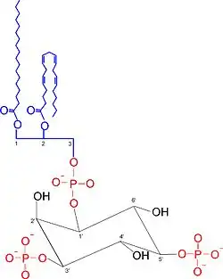 Phosphatidylinositol 3,5-bisphosphate (PtdIns(3,5)P2) is one of the seven phosphoinositides found in eukaryotic cell membranes.[1] In quiescent cells, the PtdIns(3,5)P2 levels, typically quantified by HPLC, are the lowest amongst the constitutively present phosphoinositides. They are approximately 3 to 5-fold lower as compared to PtdIns3P and PtdIns5P (Phosphatidylinositol 5-phosphate) levels, and more than 100-fold lower than the abundant PtdIns4P (Phosphatidylinositol 4-phosphate) and PtdIns(4,5)P2.[2] PtdIns(3,5)P2 was first reported to occur in mouse fibroblasts and budding yeast S. cerevisiae in 1997.[3][4] In S. cerevisiae PtdIns(3,5)P2 levels increase dramatically during hyperosmotic shock.[4] The response to hyperosmotic challenge is not conserved in most tested mammalian cells except for differentiated 3T3L1 adipocytes. [4] [5]