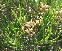 This aromatic species has sticky leaves but, unlike some other Pteronia species, the flowers are not sticky. It has slender, furrowed, needle, incurved, green leaves, held in opposite pairs.