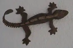 Ptychozoon was a genus of arboreal geckos, endemic to Southeast Asia, known commonly as flying geckos, gliding geckos, or parachute geckos.[1] They all are now placed in the genus Gekko in the family Gekkonidae. The biogeographic history of the genus Ptychozoon was deeply nested within that of the genus Gekko, the center of diversity of which is within Southeast Asia. Since dispersing into Southeast Asian rainforests, Pytochozoon, like other forest-dwelling vertebrates, adapted to facilitate gliding.[2] All species in the genus Ptychozoon are characterized by cryptic coloration and elaborate webs surrounding the neck, limbs, trunk, and tail.[1] These membranes help to conceal the gecko against trees. When the gecko leaps into the air, the flaps are used to generate lift and allow the gecko to control its fall. It can glide up to 200 feet (61 meters). Also it does a swoop at the end of its glide to land softly. A similar adaptation is found in geckos of the genus Cosymbotus. There were thirteen described species in the genus Ptychozoon.