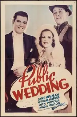 Public Wedding is a 1937 American comedy film directed by Nick Grinde and written by Roy Chanslor and Houston Branch. The film stars Jane Wyman (in her first starring role), William Hopper, Dick Purcell, Marie Wilson, Berton Churchill and Archie Robbins.[1] The film was released by Warner Bros. on July 10, 1937.[2][3][4]