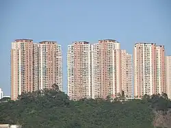 Kwai Fong Estate (Chinese: 葵芳邨) is built on the reclaimed land of Gin Drinkers Bay, later the town centre of Kwai Chung, and the south of Kwai Hing Estate. Kwai Fong station is named from the name of the estate. It comprises 12 buildings with a total of 6400 units and 1 shopping arcade. Before redevelopment, it consisted of 11 buildings which were completed between 1971 and 1973. In 1982, the buildings were revealed to have structural defects.[21] In 1985, the HKHA announced that the strength of the concrete in blocks 8, 9, 10 and 11 of Kwai Fong Estate was below standard. Those blocks were demolished between 1985 and 1989.[22] Other old buildings were also demolished in the 1990s to cope with the estate redevelopment. The estate was later redeveloped with 12 new buildings built between 1987 and 2002.