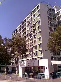 Shek Kip Mei Estate (Chinese: 石硤尾邨) is the first public housing estate in Hong Kong.[12] The estate was constructed as a result of a fire in Shek Kip Mei in 1953, to settle the families of inhabitants in the squats over the hill who lost their homes in one night.