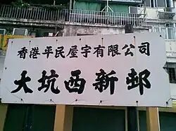 Tai Hang Sai Estate (Chinese: 大坑西邨) is a private housing estate in Shek Kip Mei, located between Shek Kip Mei Estate and Tai Hang Tung Estate, near MTR Shek Kip Mei station. It consists of 8 residential buildings which were built in 1965 and 1977 respectively. The estate was built and managed by a privately owned company called "Hong Kong Settlers Housing Corporation Limited" (Chinese: 香港平民屋宇有限公司).[14]