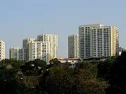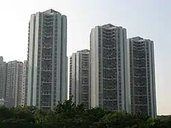 Greenview Villa (Chinese: 綠悠雅苑) is the first Subsidized Sale Flats Project court developed by the Hong Kong Housing Society in Tsing Luk Street, Tsing Yi. It consists of three 38-storey residential towers providing 988 residential units on a 2-storey podium with landscape garden, car park and recreational facilities, with an extensive on-grade landscape garden.[23][24] The flats were sold in 2012 to individuals with a monthly income of HK$25,000 or less, and to households with a monthly income of HK$40,000 or less and they were priced from HK$5,841 to HK$7,402 per sq ft in terms of saleable area - a 30 per cent market discount.[25] It completed in 2015.[23]