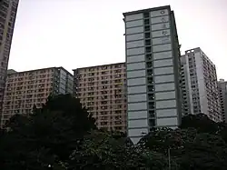 Ching Wang Court (Chinese: 青宏苑) is a HOS in Tsing Yi, near Cheung On Estate, Cheung Fat Estate and Villa Esplanada.[15] Formerly the site of Ching Fat Temporary Housing Area,[16] it consists of 2 residential buildings completed in 2001.[17]