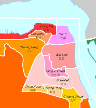 Tsing Yi Estate (Chinese: 青衣邨) is the only public housing estate on Tsing Yi Island which name does not start with the character Cheung (長). This is due to the fact that the estate was named in the memory of Tsing Yi Town (青衣墟), a traditional market town which was demolished in the 1980s to make way for new town developments. Since the estate was situated at the seaside of old Tsing Yi Town, part of it is built on reclaimed land. The estate consists of four high-rise blocks of flats.