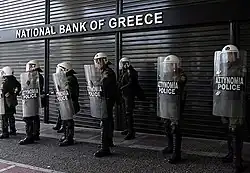 Public pensions in Greece are designed to provide incomes to Greek pensioners upon reaching retirement. For decades pensions in Greece were known to be among the most generous in the European Union, allowing many pensioners to retire earlier than pensioners in other European countries.[1] This placed a heavy burden on Greece's public finances which, coupled with an aging workforce, made the Greek state increasingly vulnerable to external economic shocks, culminating in a recession due to the 2008 financial crisis and subsequent European debt crisis. This series of crises has forced the Greek government to implement economic reforms aimed at restructuring the pension system and eliminating inefficiencies within it.[2] Measures in the Greek austerity packages imposed upon Greek citizens by the European Central Bank have achieved some success at reforming the pension system despite having stark ramifications for standards of living in Greece, which have seen a sharp decline since the beginning of the crisis.[3]