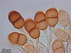 Also known as the black spore phase. Near the beginning of autumn, production of rust-colored urediospores is replaced by the formation of black over-wintering spores.[19][21] These spores are designed to withstand the harsh winter conditions. The large, two-celled, thick-walled, black teliospores are formed either in existing uredia or newly formed pustules.[6] Spores overwinter on host plant residue, germinate in early spring, and produce new infections on growing asparagus spears. The black-brown lesions are called telia and give a blackish hue to the top of the plants.[24][25] The teliospores remain attached in the pustules on asparagus plant parts or plant debris for the remainder of the season and throughout winter.[21] Around springtime when young asparagus shoots are emerging, the overwintering teliospores germinate on the old stems to produce sporidia. The sporidia (also called basidiospores) infect nearby emerging shoots or spears.[23] This infection results in pycnia, producing pyciniospores and repeating the disease cycle.