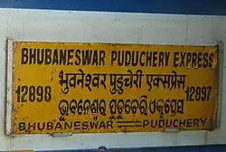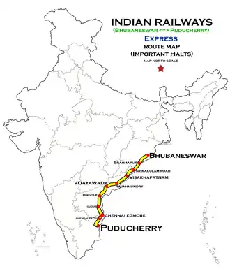 The Puducherry– Bhubaneswar Superfast Express is a Superfast train belonging to East Coast Railway zone that runs between Puducherry and Bhubaneswar in India. It is currently being operated with 22907/22908 train numbers on a weekly basis.[1] [2] [3]