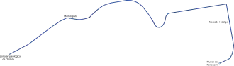 The 17.4 km (10.8 mi) single-track route largely utilized existing rail rights-of-way to the north and west of the city of Puebla. The route began at the National Railway Museum in Puebla's city centre. The first 2 km (1.2 mi) of the route operated as a tram line without any stops along city streets with mixed vehicle traffic. The remainder of the route utilized a dedicated at-grade right-of-way from Puebla to Cholula Station adjacent to the Cholula Archaeological Zone. An additional two intermediate stops, Mercado Hidalgo Station and Momoxpan Station, were constructed but have not been opened.[3]