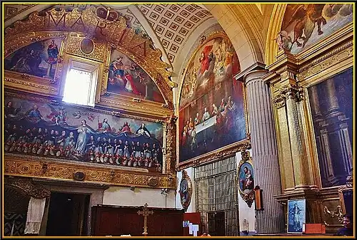 The large space is surrounded by a large chest of drawers made of fine wood that houses the rich and abundant liturgical ornaments and in the middle a large table made of fine wood in the Renaissance style. The upper part of the sacristy is full of paintings. The large canvas in the background represents The Triumph of the Catholic Church over paganism, the lateral panels cover them, on the left, the painting of "The Triumph of the faith of Jesus Christ over the pagan theogony" and on the right another of the "Triumph of the religion", all by the 17th-century Mexican painter Baltasar de Echave Rioja that were copied from prints by Paul Rubens. Other canvases on the Revelations of the Apocalypse, also by Echave Rioja, crown the midpoints of the side panels. All these paintings are framed in gilt altarpieces of composite order of great aesthetic appeal.