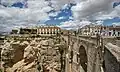 The construction of the newest bridge (the one standing as of 2024) was started in 1759 and took 34 years.[1] There is a chamber above the central arch that was used for a variety of purposes, including as a prison. During the 1936–1939 civil war both sides allegedly used the prison as a torture chamber for captured opponents, killing some by throwing them from the windows to the rocks at the bottom of the El Tajo gorge.[2] The chamber is entered through a square building that was once the guard-house. It now contains an exhibition describing the bridge's history and construction.